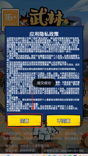1、点击“同意”按钮,接受隐私政策与游戏协议,进入主界面。