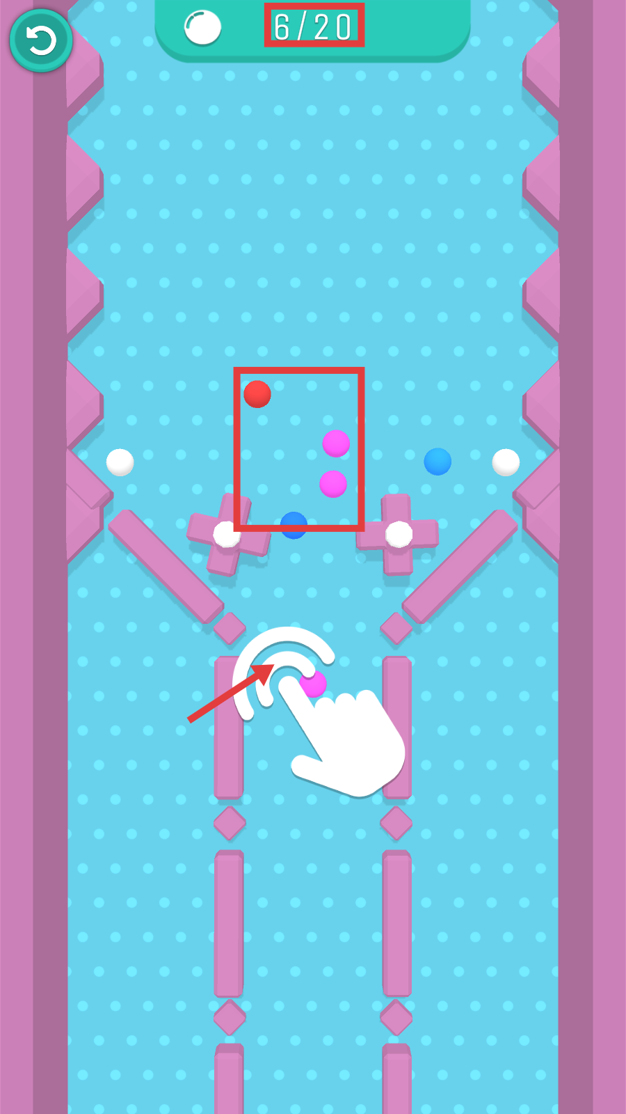 1、看准时机点击彩色球,使其下落,滑动屏幕操纵小球左右移动,注意避开粉色障碍物,朝着目标区域引导。