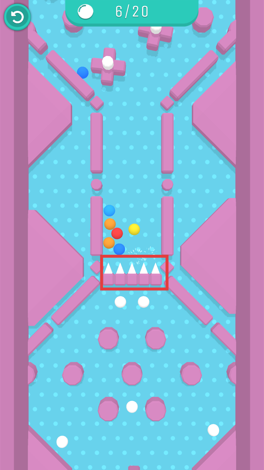 2、利用场景中的布局,让彩色球碰撞反弹,尽可能多地收集沿途白色小球,增加数量。