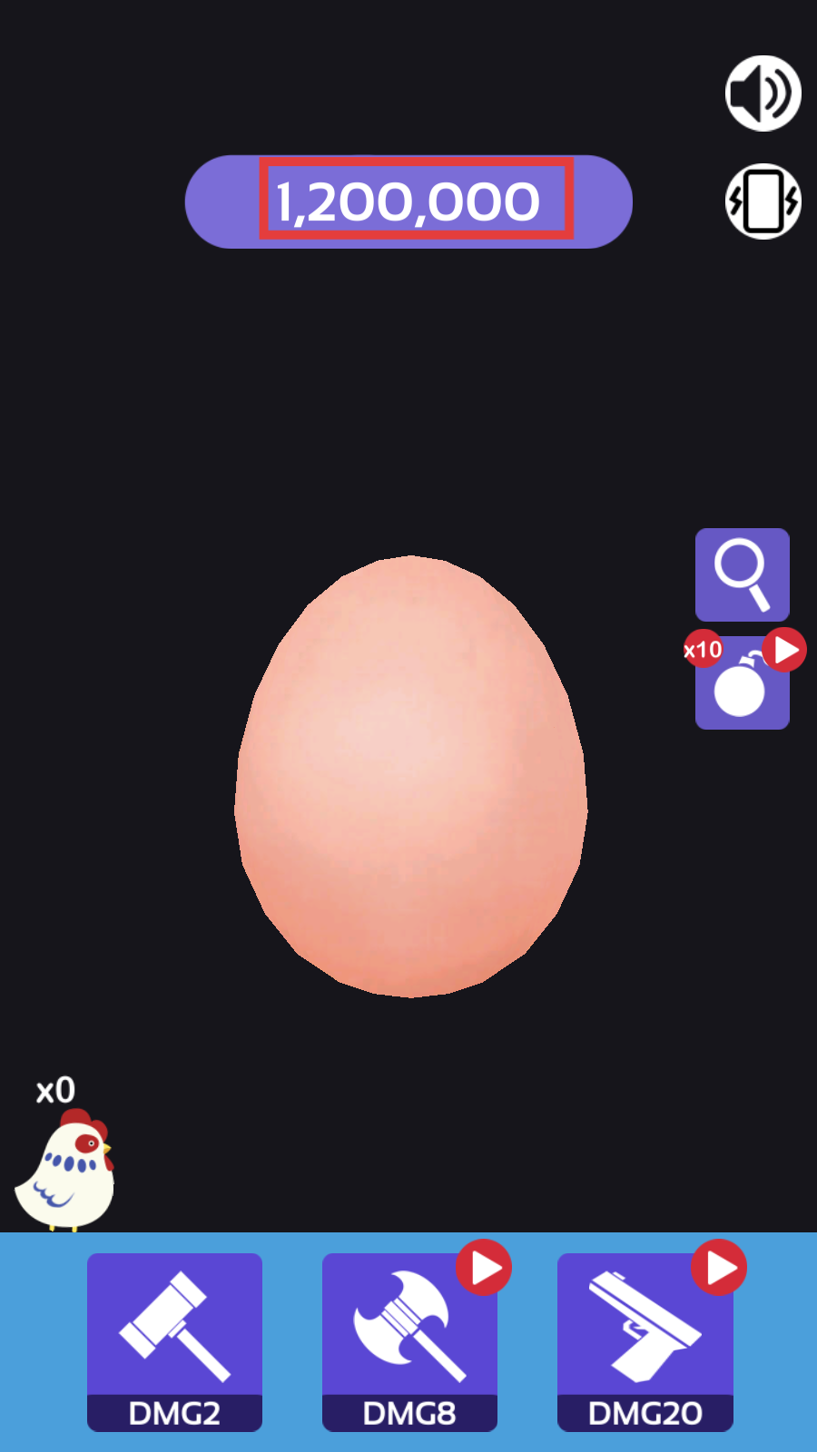 1、关注上方鸡蛋【1,200,000】生命值,优先选择高伤害道具如【DMG20】武器,快速削减生命值。