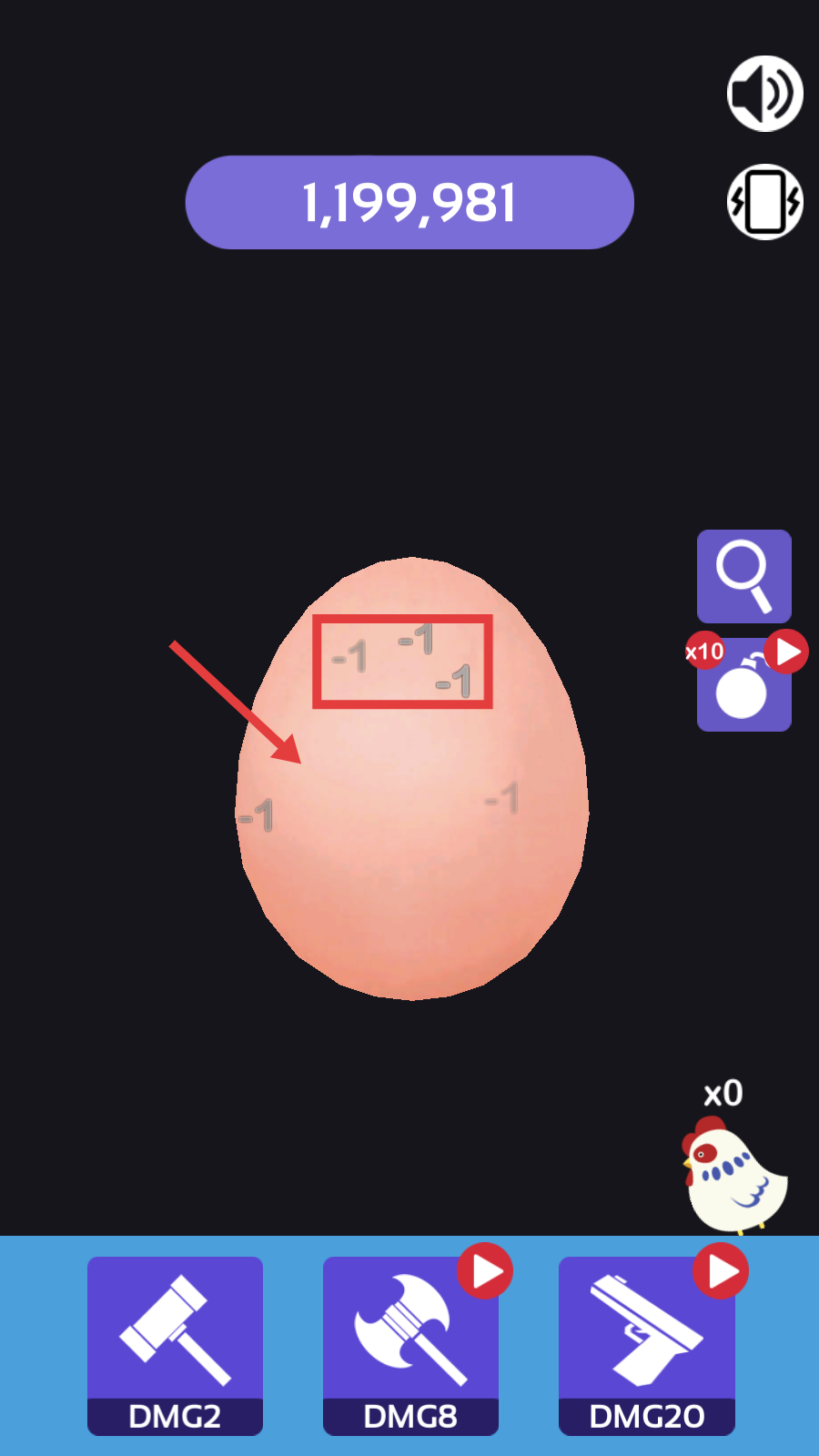 3、点击左下角【锤子】道具图标,每点击一下,鸡蛋的生命值从【-1】变成【-2】,只有8秒的限定时间。
