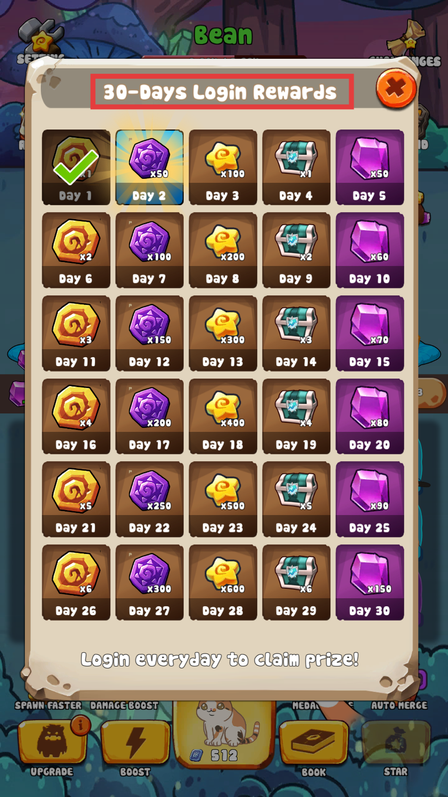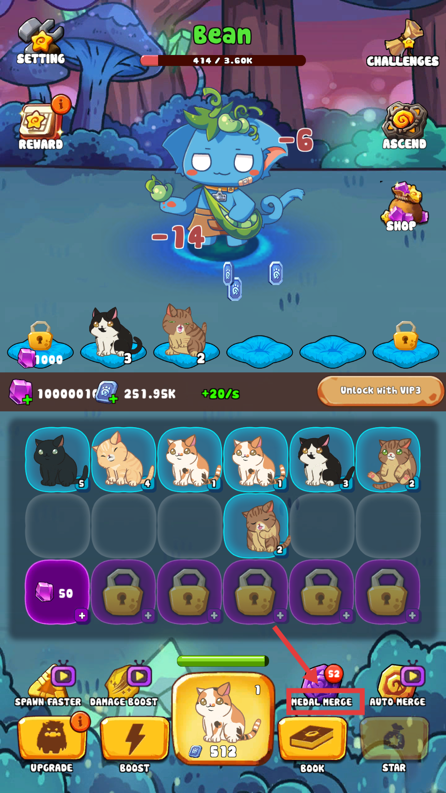 2、利用【MEDAL-MERGE】功能合并猫咪,提升猫咪等级,增强对【Bean】等怪物的攻击力。