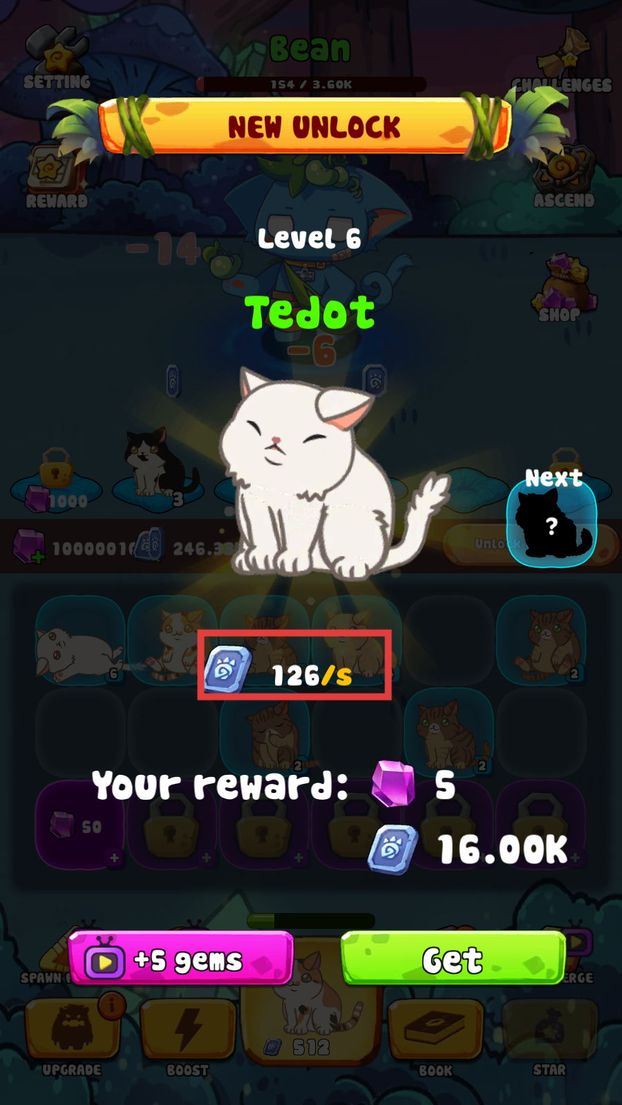 3、解锁新猫咪如【Tedot】后,及时领取奖励,利用【宝石】和【货币】提升猫咪属性,增加每秒收益。