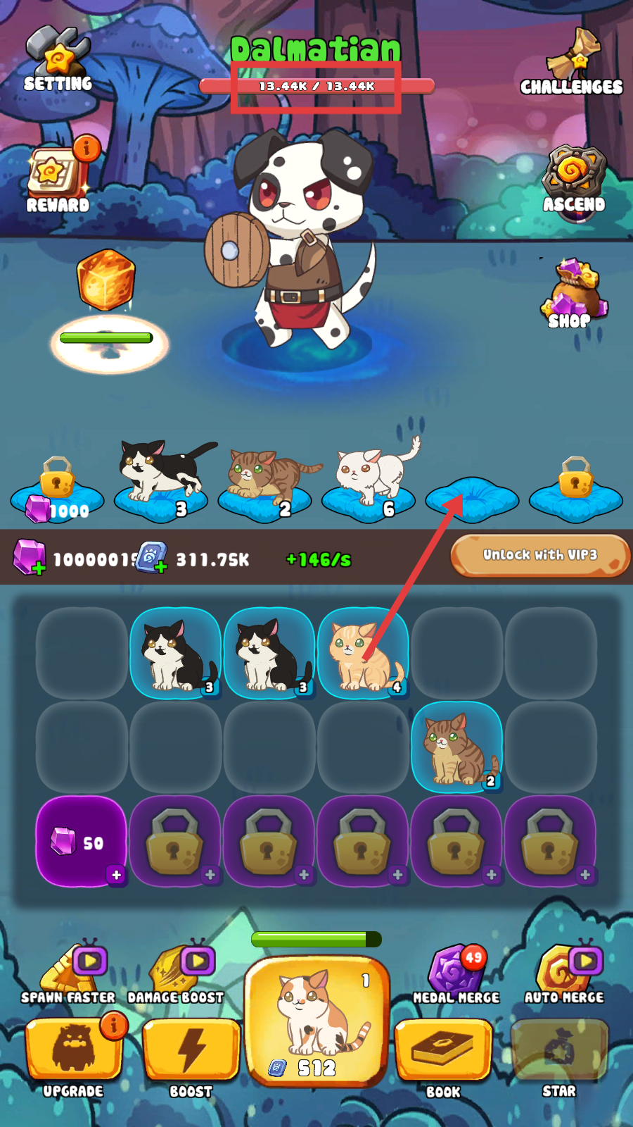 4、关注怪物血量,如【Dalmatian-13.44K/13.44K】,合理调配猫咪,优先放置高等级猫咪攻击怪物。