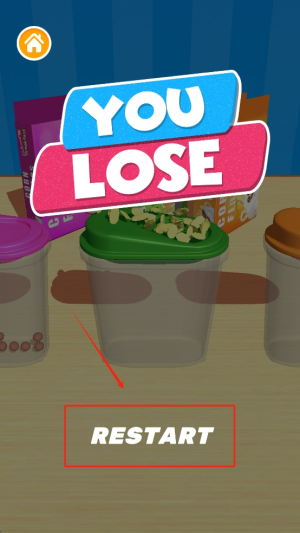 4、重新开始:如果物品放错容器导致游戏失败,点击“RESTART”按钮重新开始当前关卡。