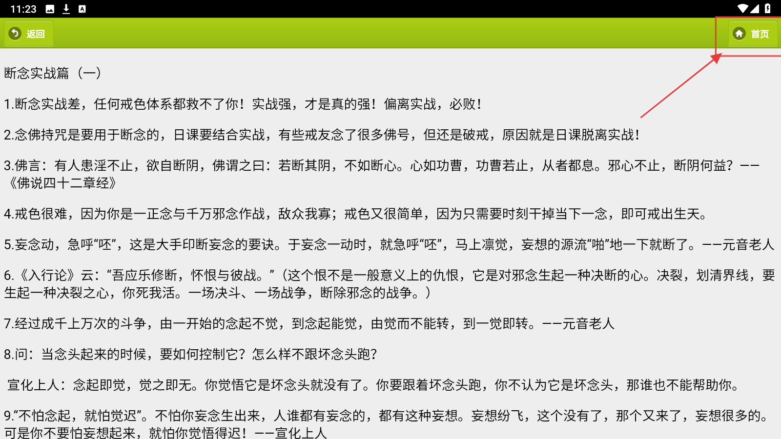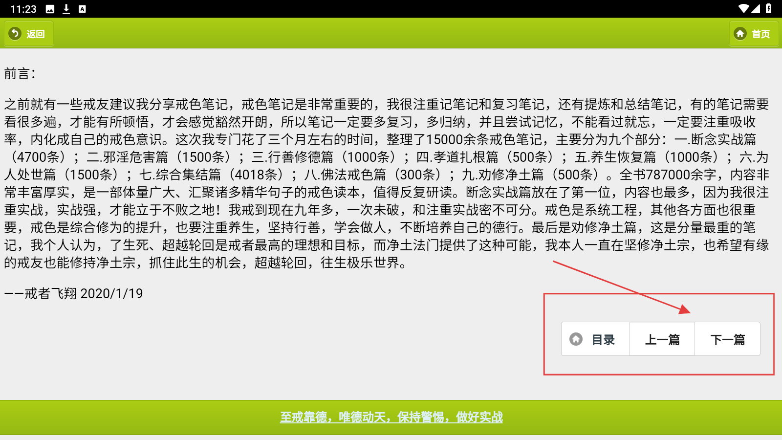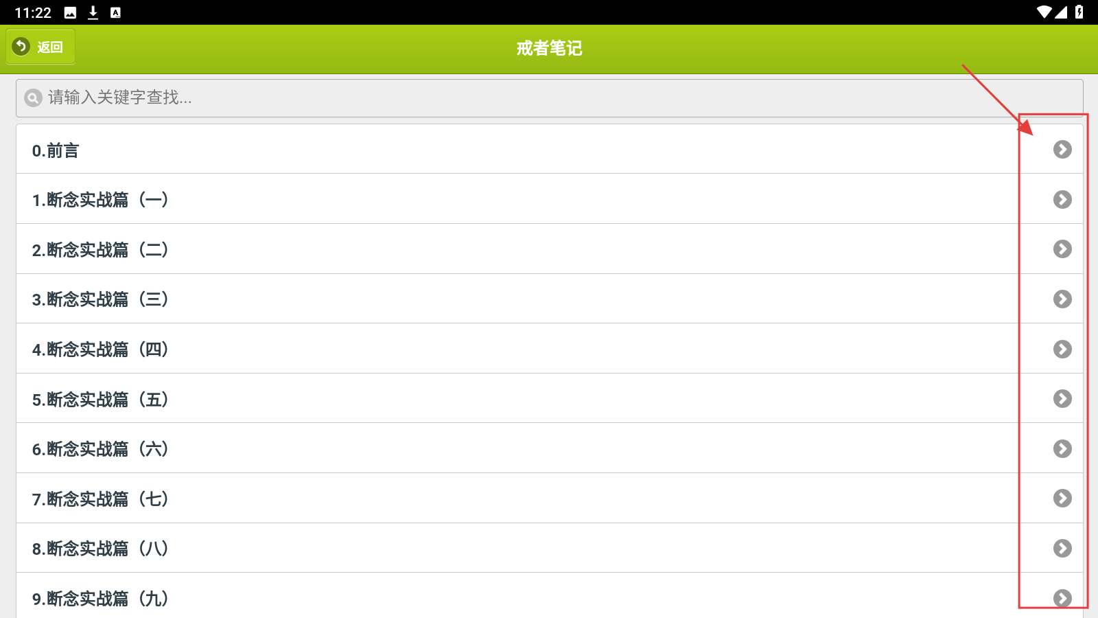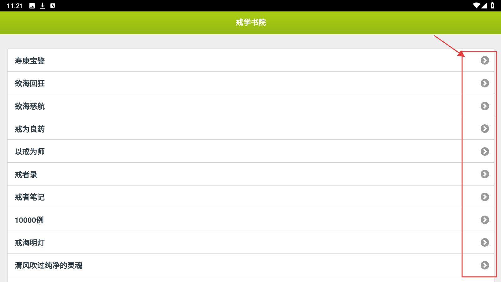 1、打开【戒学书院】应用,选择想看的文章,点击文章后面的图标进入文章目录页面。