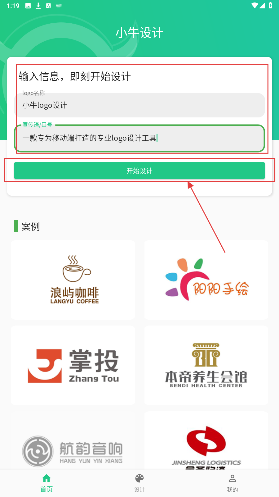 1、打开【小牛设计】APP,在首页输入logo名称和宣传语/口号,点击【开始设计】按钮,进入行业选择页面。