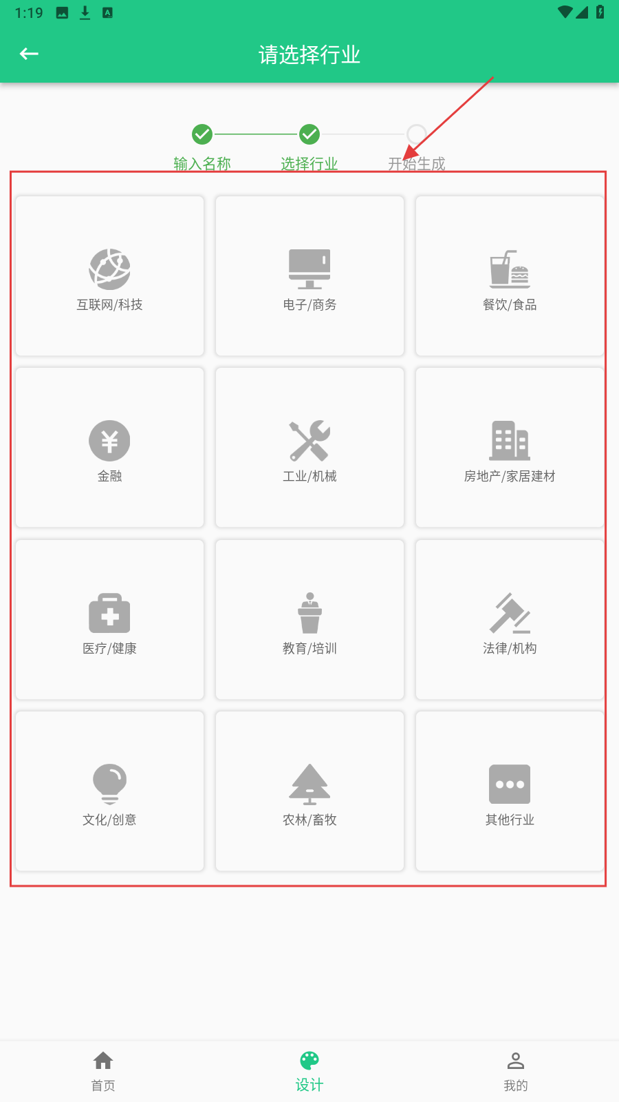 2、在行业选择页面,选择与logo相关的行业,如互联网/科技、电子/商务等。