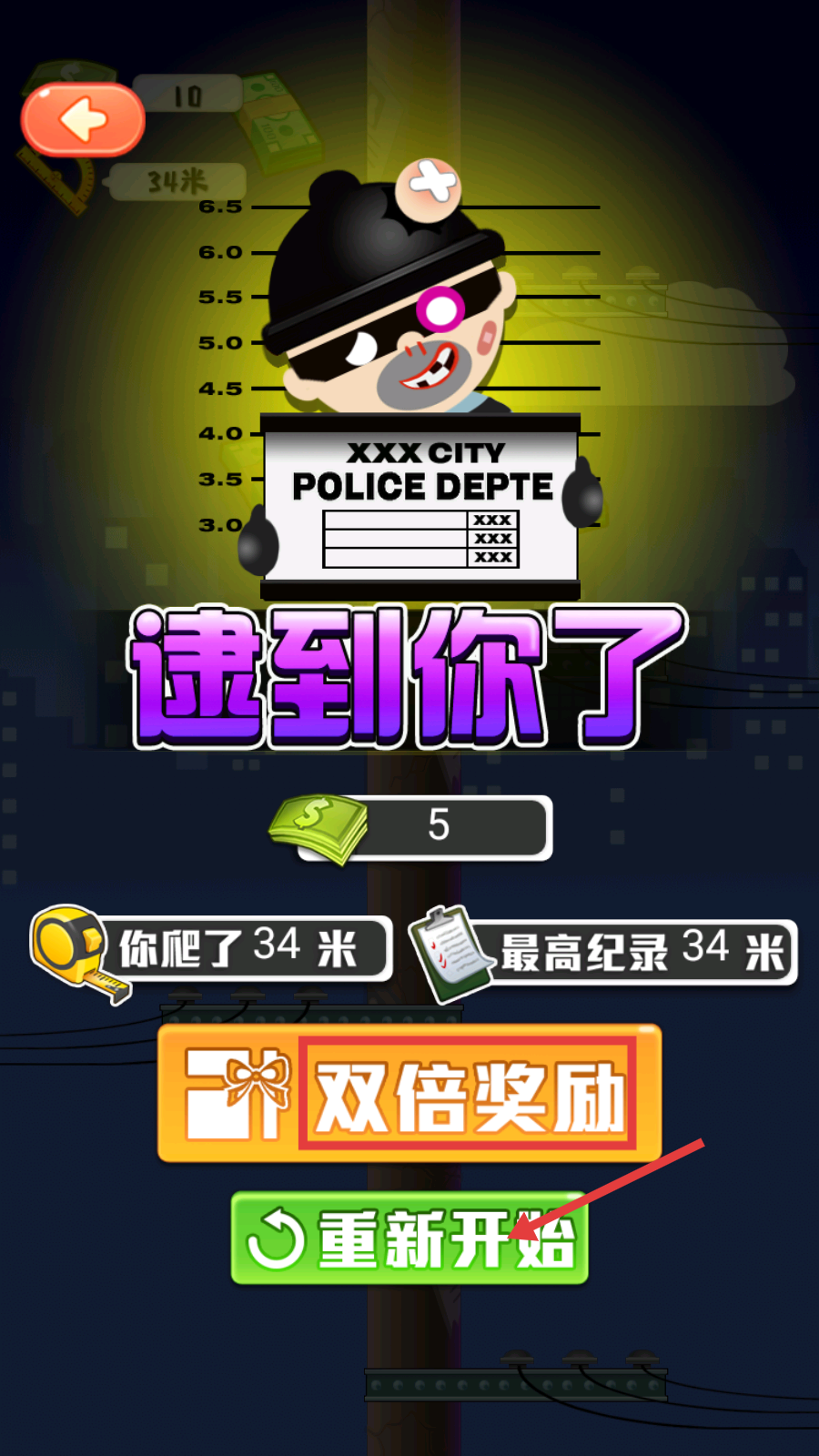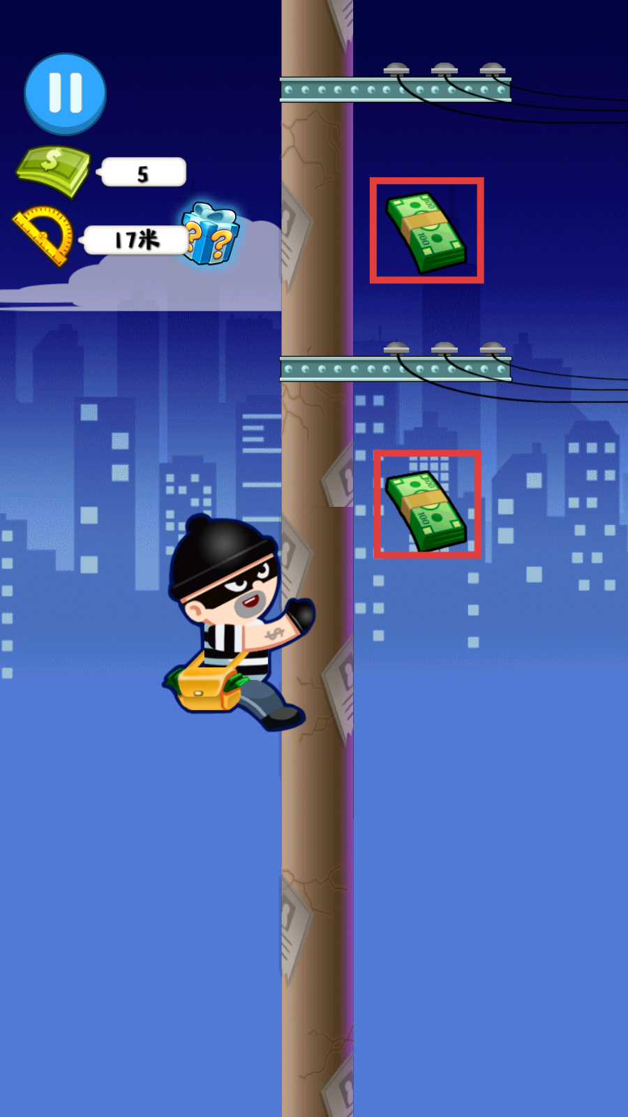 3、尽量收集【钞票】道具,增加游戏收益,同时注意躲避下方警察的追捕。