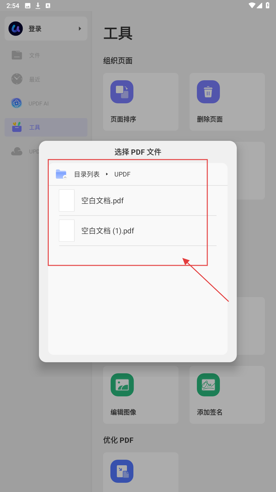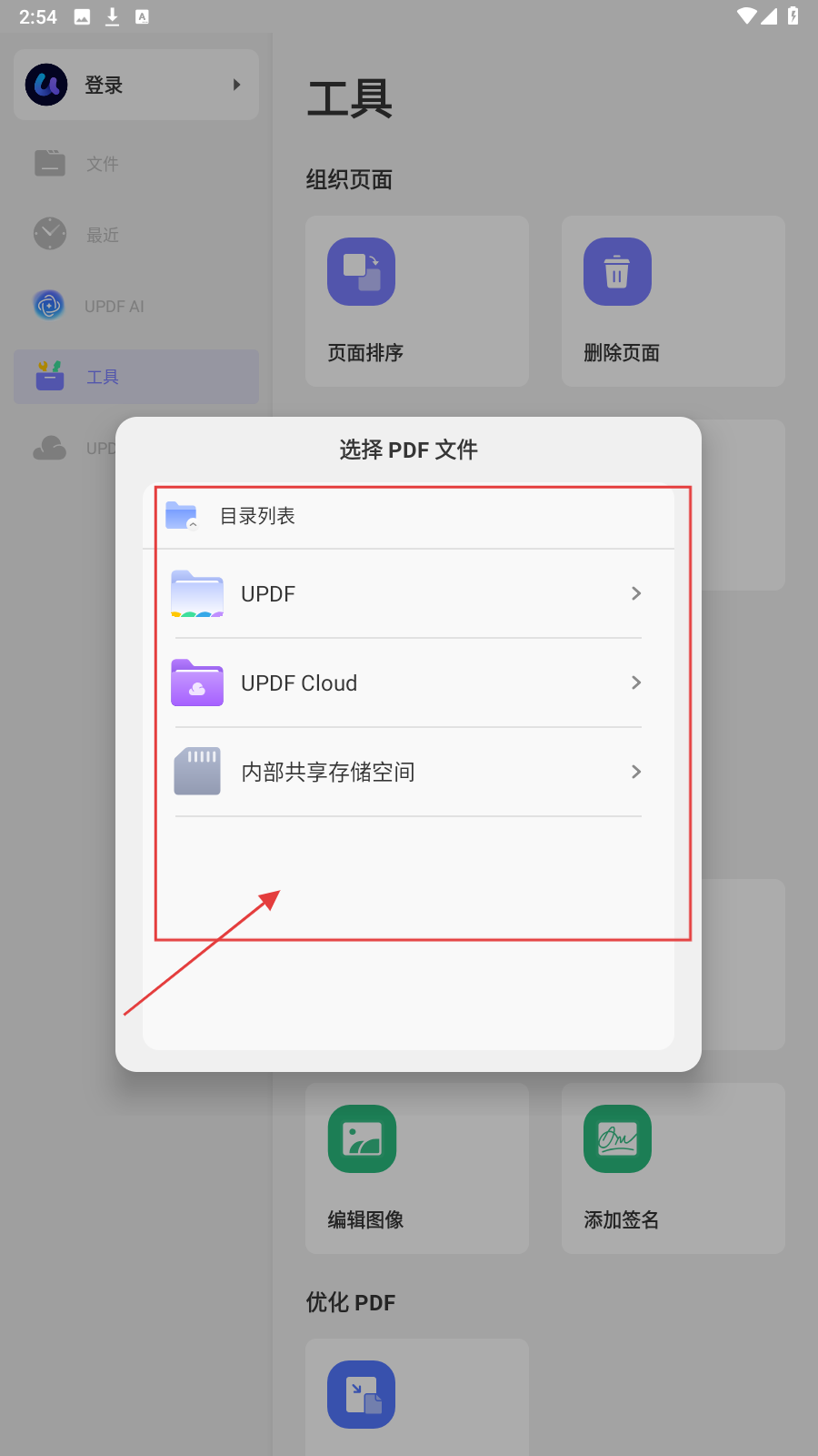 2、选择PDF文件时,可从【UPDF】【UPDFCloud】【内部共享存储空间】等目录中查找所需文件。