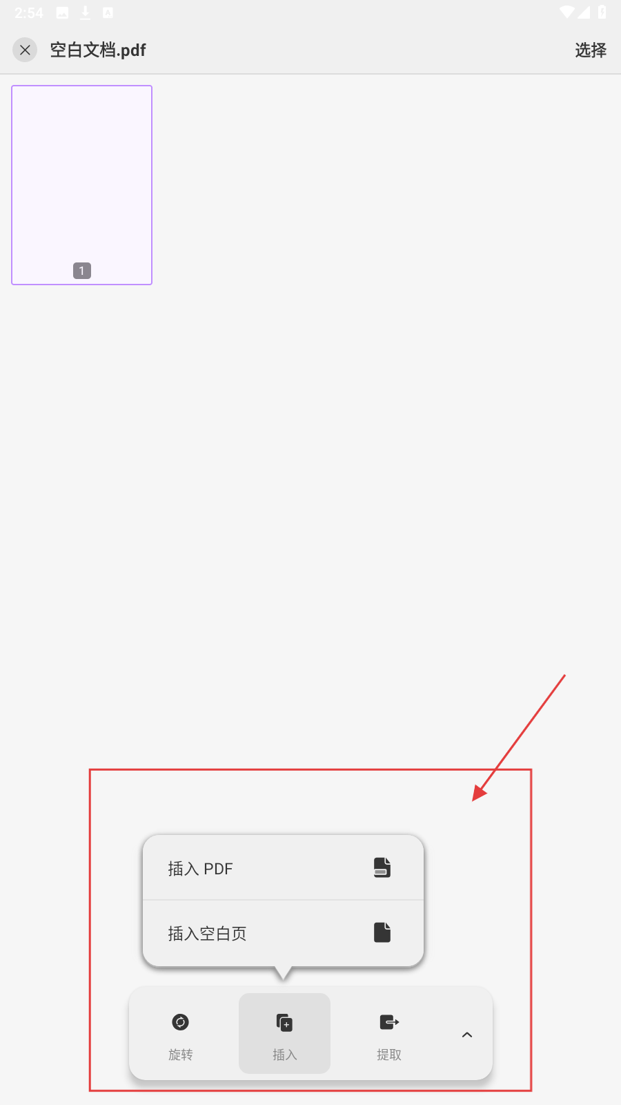 4、打开PDF文件后,点击底部【插入】按钮,可选择【插入PDF】或【插入空白页】,满足不同编辑需求。