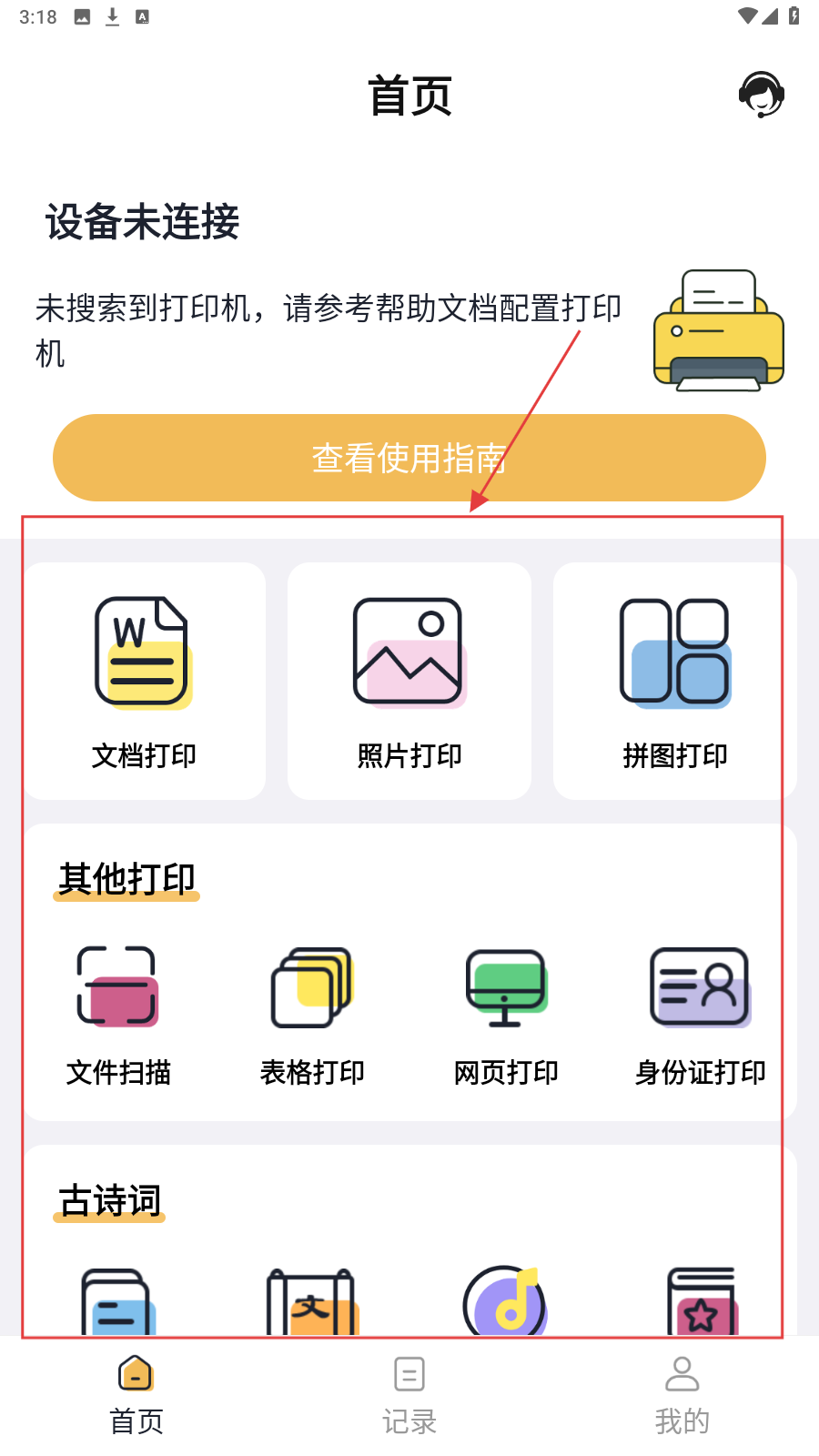 1、在首页可使用【文档打印】【照片打印】等打印功能,还有【文件扫描】等其他打印选项及古诗词板块。