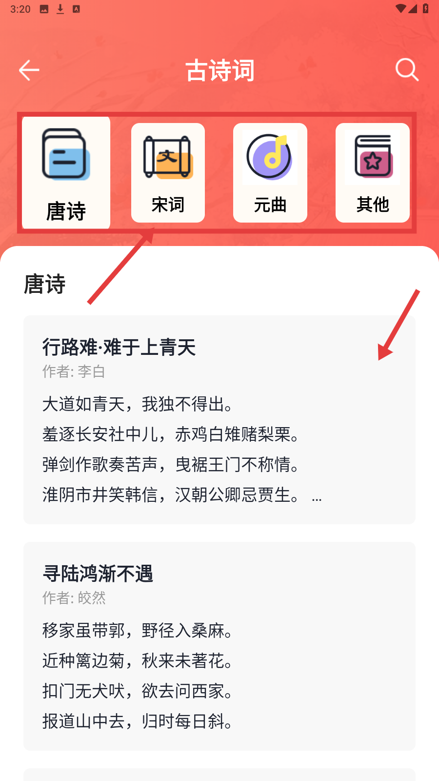 2、进入古诗词板块,可选择【唐诗】【宋词】等分类,查看对应诗词内容。