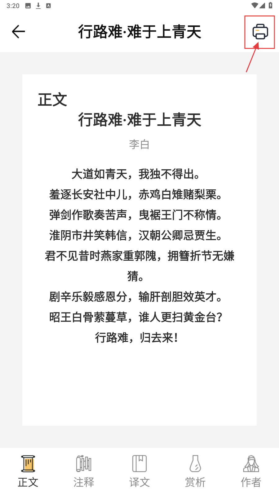 3、打开具体诗词页面,点击右上角打印图标,即可进行打印操作。
