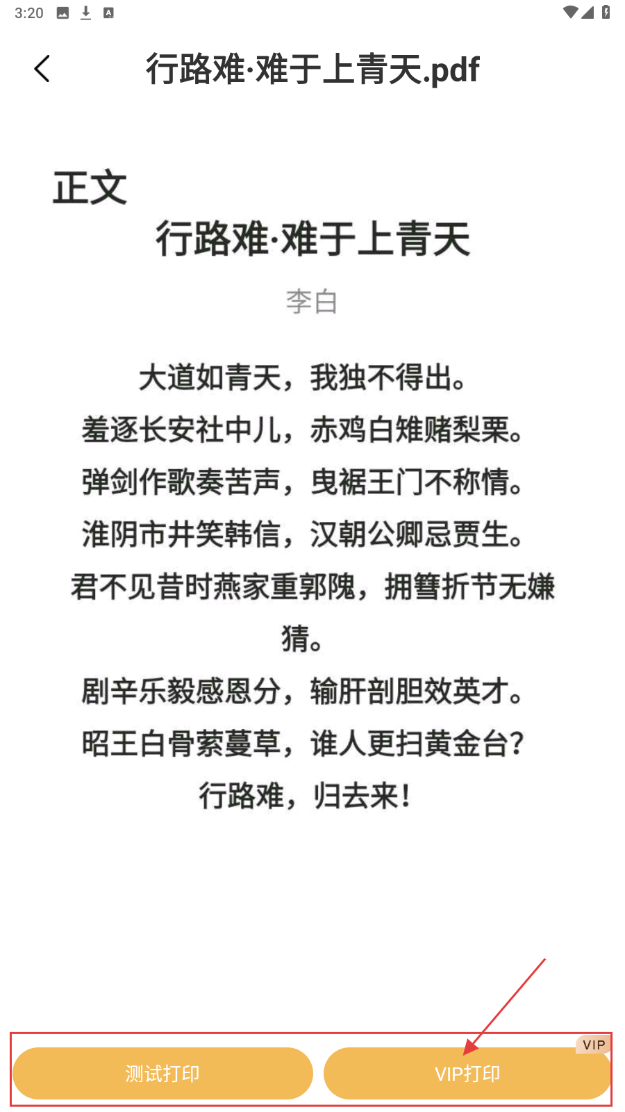 4、在打印预览页面,可选择【测试打印】或【VIP打印】,按需完成诗词内容的打印。