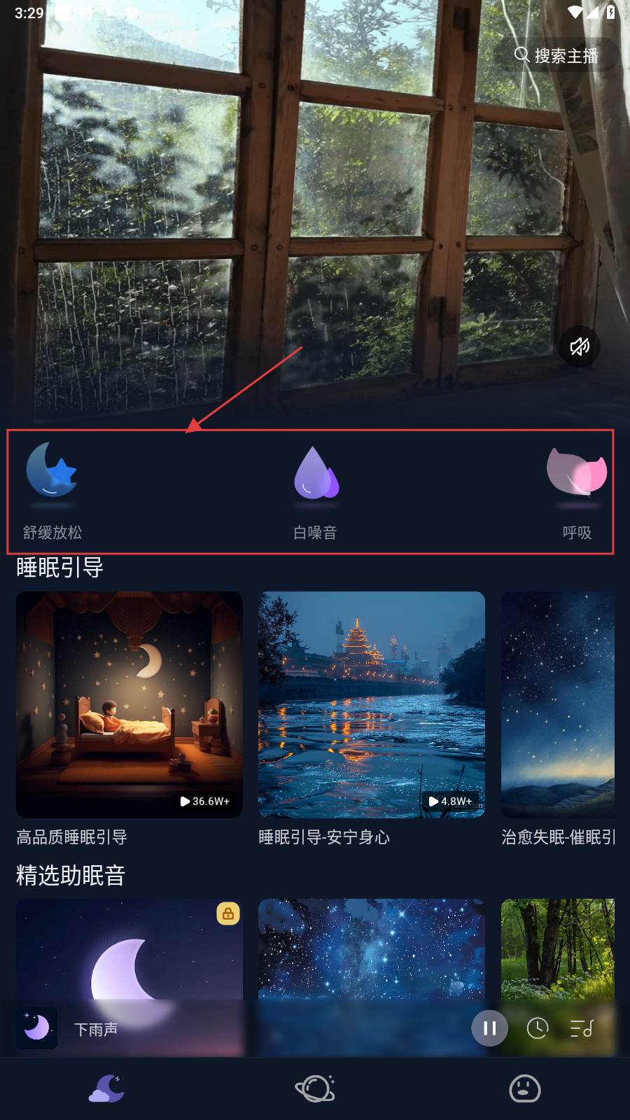 1、在首页可选择【舒缓放松】【白噪音】【呼吸】等功能,还有睡眠引导和精选助眠音板块可体验。