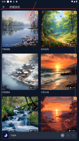 2、进入舒缓放松板块,可选择【平静湖面】【花间虫鸣】等不同场景的舒缓内容,感受放松氛围。