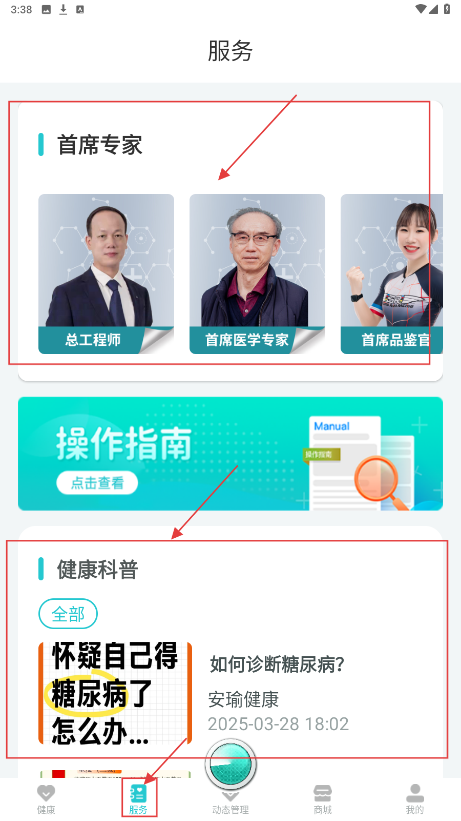 1、在【服务】页面,可了解【首席专家】信息,查看【健康科普】文章,获取健康知识。