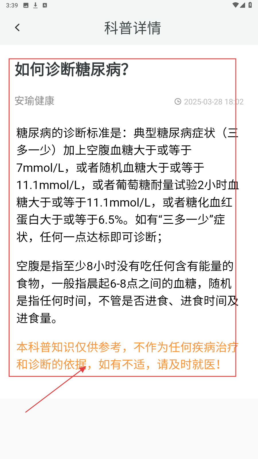 3、打开健康科普文章,可查看糖尿病诊断等详细科普知识,了解诊断标准、注意事项等内容。