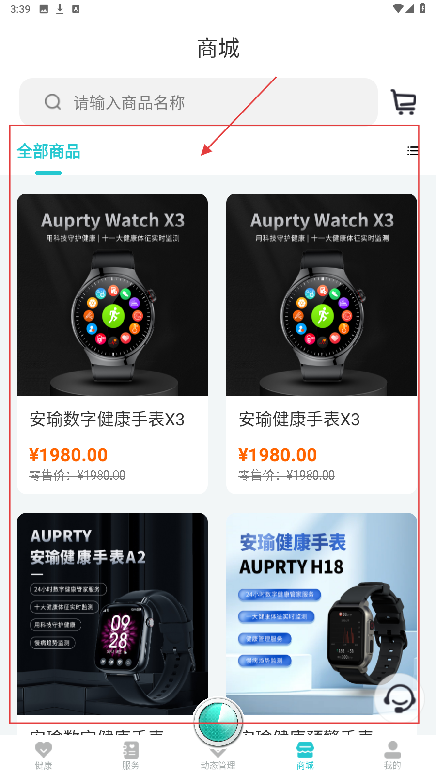 4、进入【商城】页面,可浏览安瑜数字健康手表X3等各类健康产品,了解产品价格和功能等信息。
