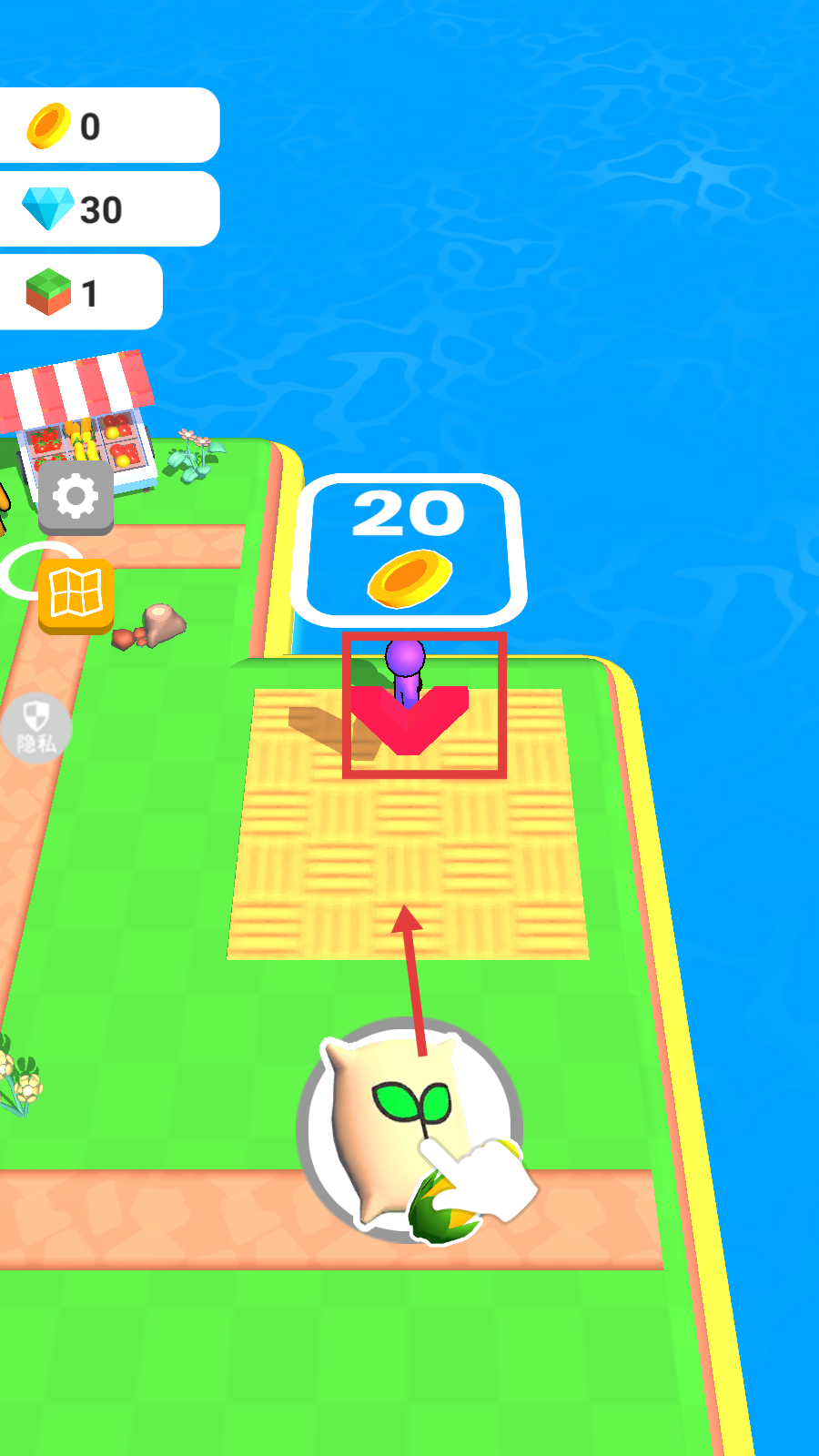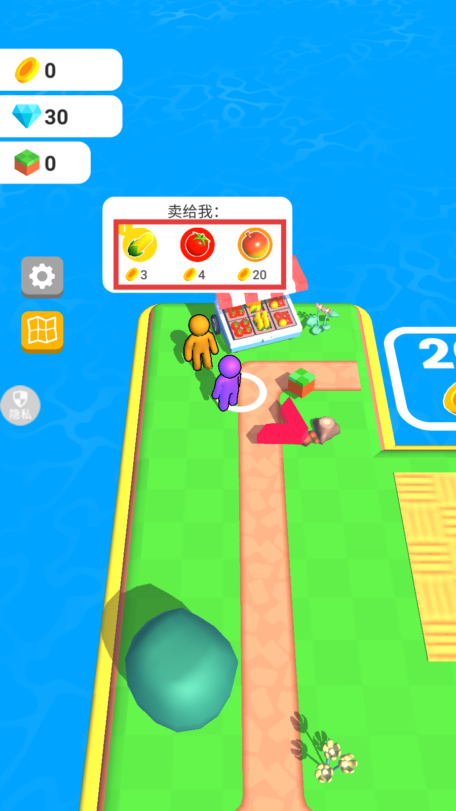 2、留意屏幕上方资源栏,关注金币、钻石和方块数量变化。遇到橙色角色的摊位,可按需用金币购买玉米、番茄、橙子等物品。
