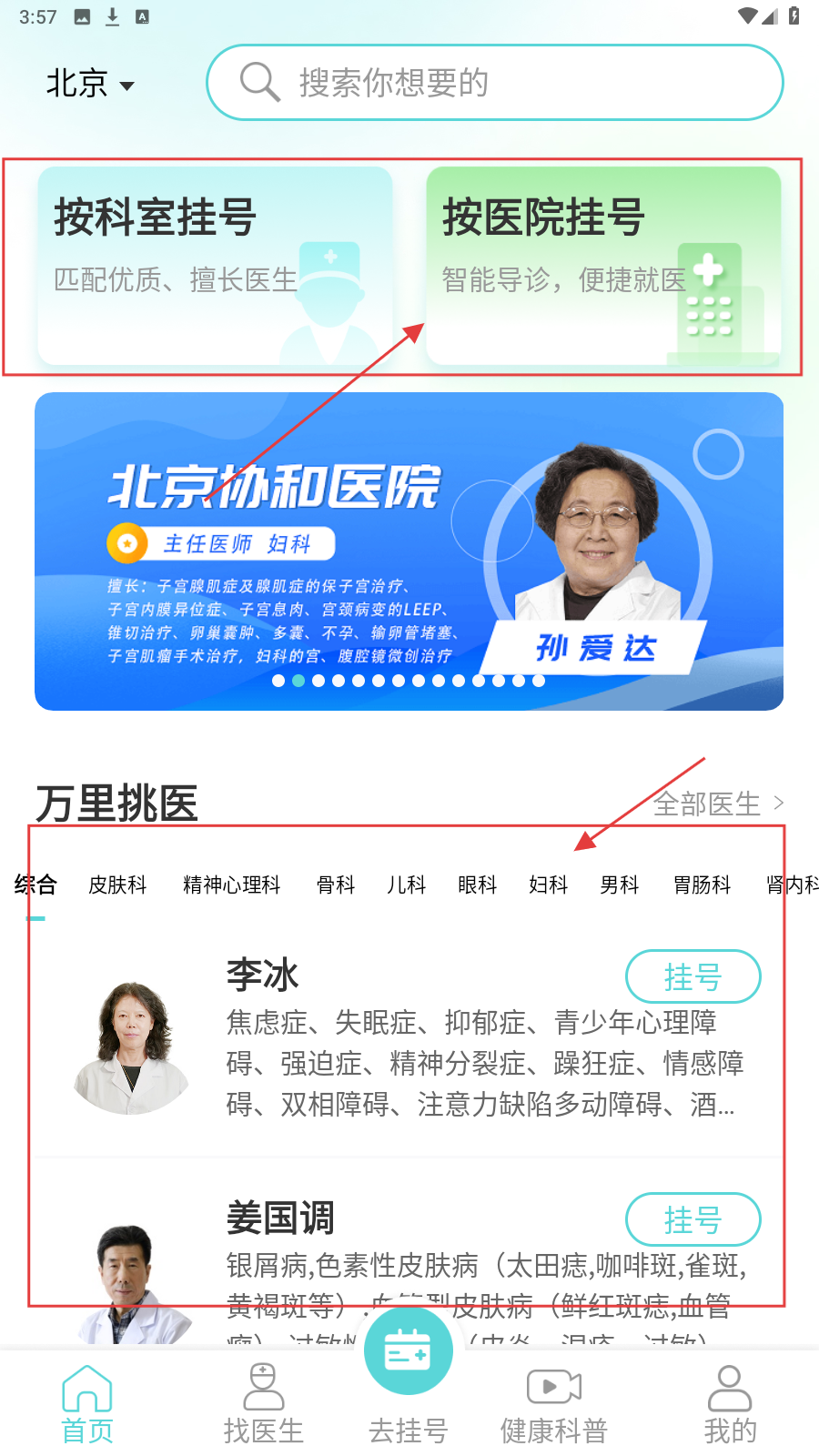 1、在首页可选择【按科室挂号】或【按医院挂号】,还能在【万里挑医】板块查看医生信息。