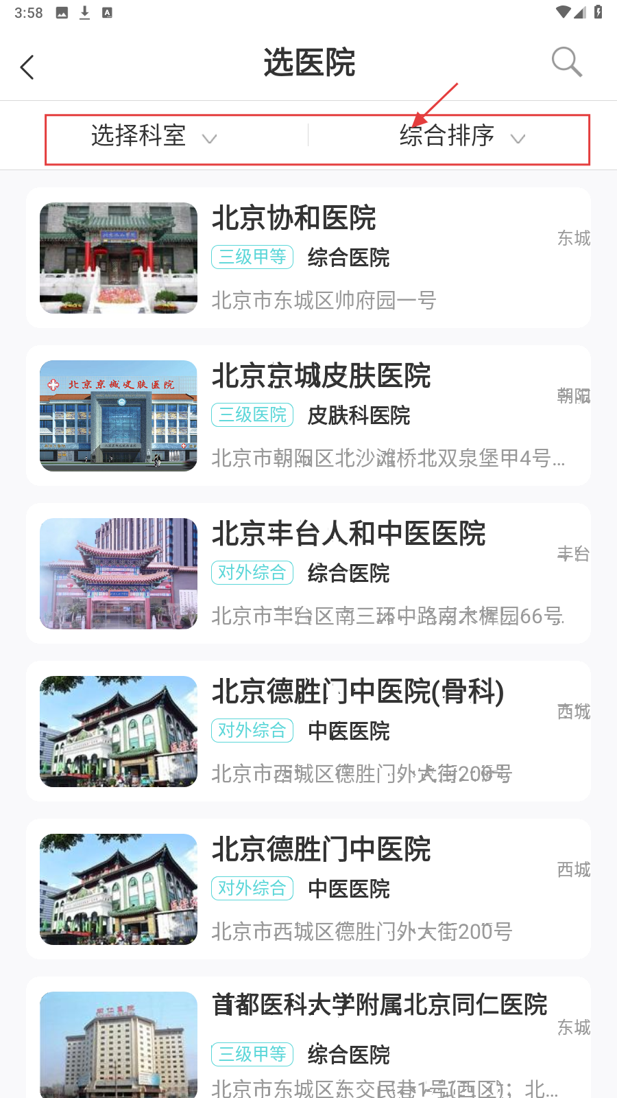 2、进入选医院页面,可通过【选择科室】和【综合排序】筛选医院,查看医院详细信息。