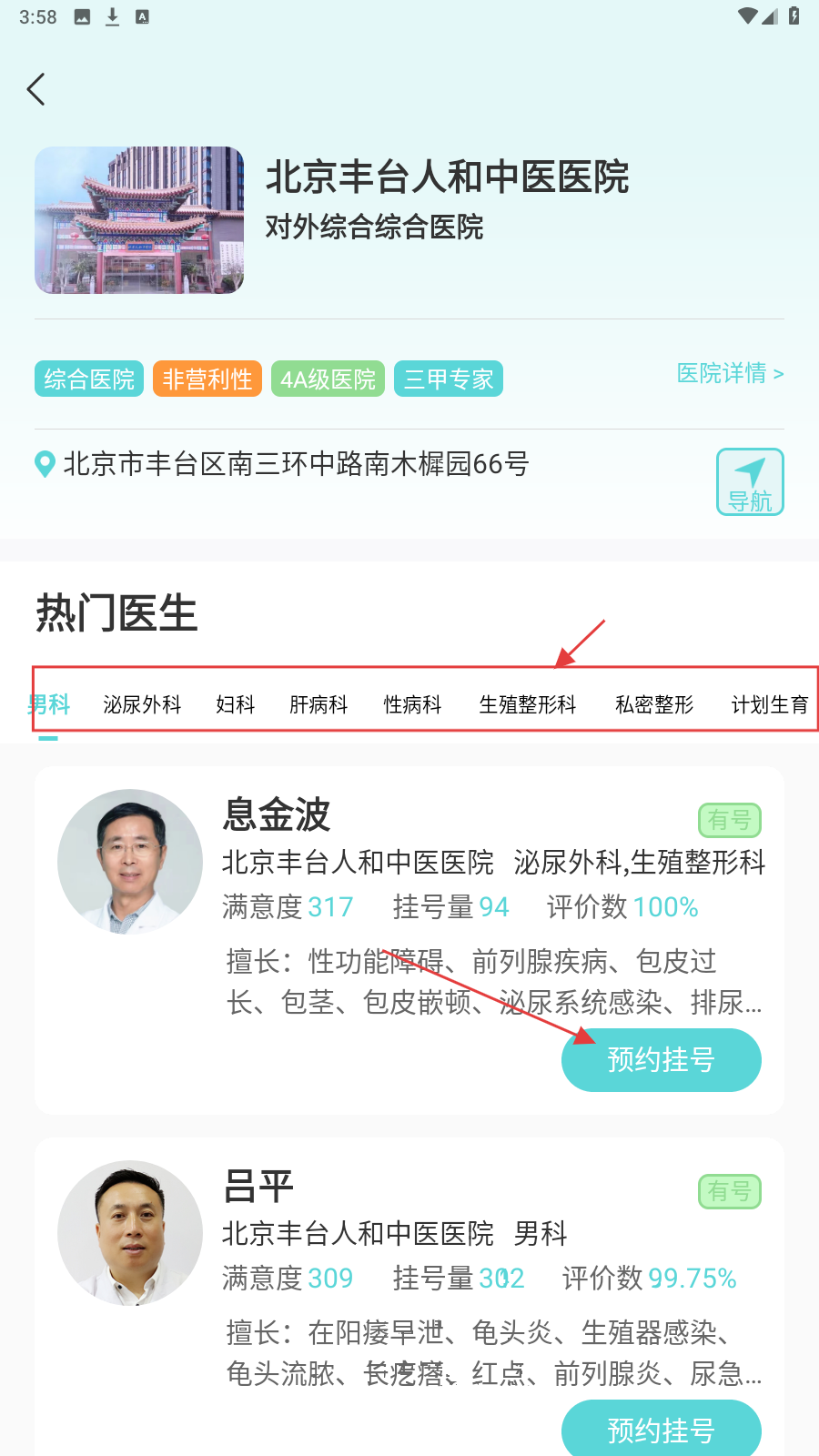 3、打开医院详情页面,可查看热门医生信息,选择对应科室医生进行【预约挂号】。