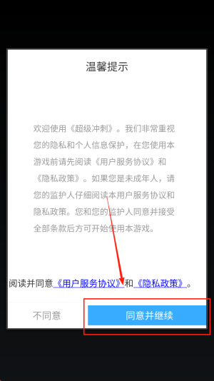 2、首次打开游戏?在弹窗中点击“同意并继续”,确认已阅读《用户服务协议》和《隐私政策》。