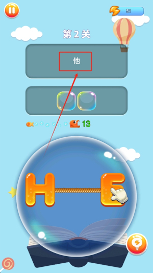 3、完成单词拼写后,点击“他”按钮,确认答案并进入下一关。