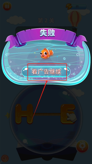 4、如果挑战失败,可以选择“看广告继续”按钮,观看广告后继续游戏。