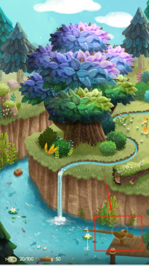 3、点击池塘边的钓鱼竿,开始钓鱼,收集游戏资源。