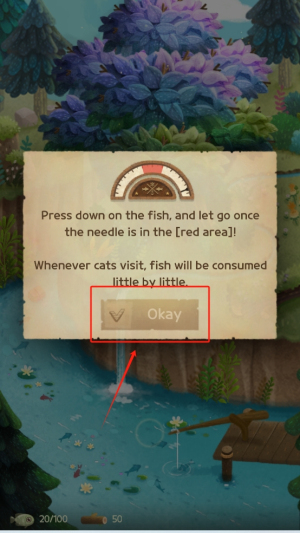 4、阅读并点击“Okay”按钮,了解钓鱼机制和猫咪互动方式。