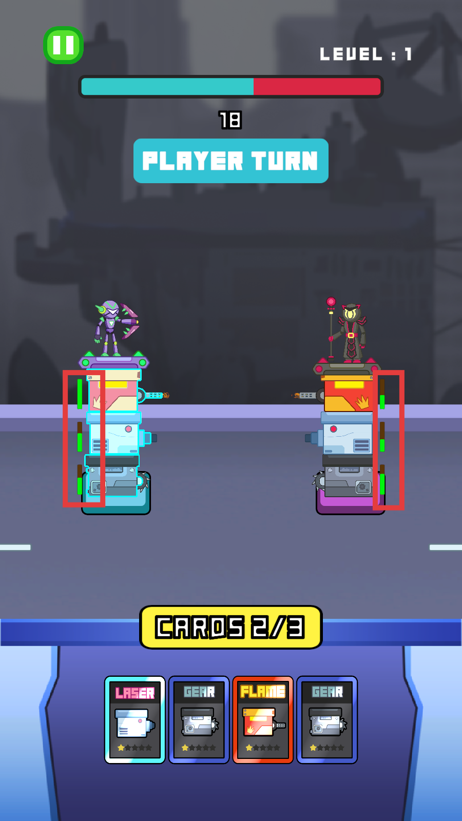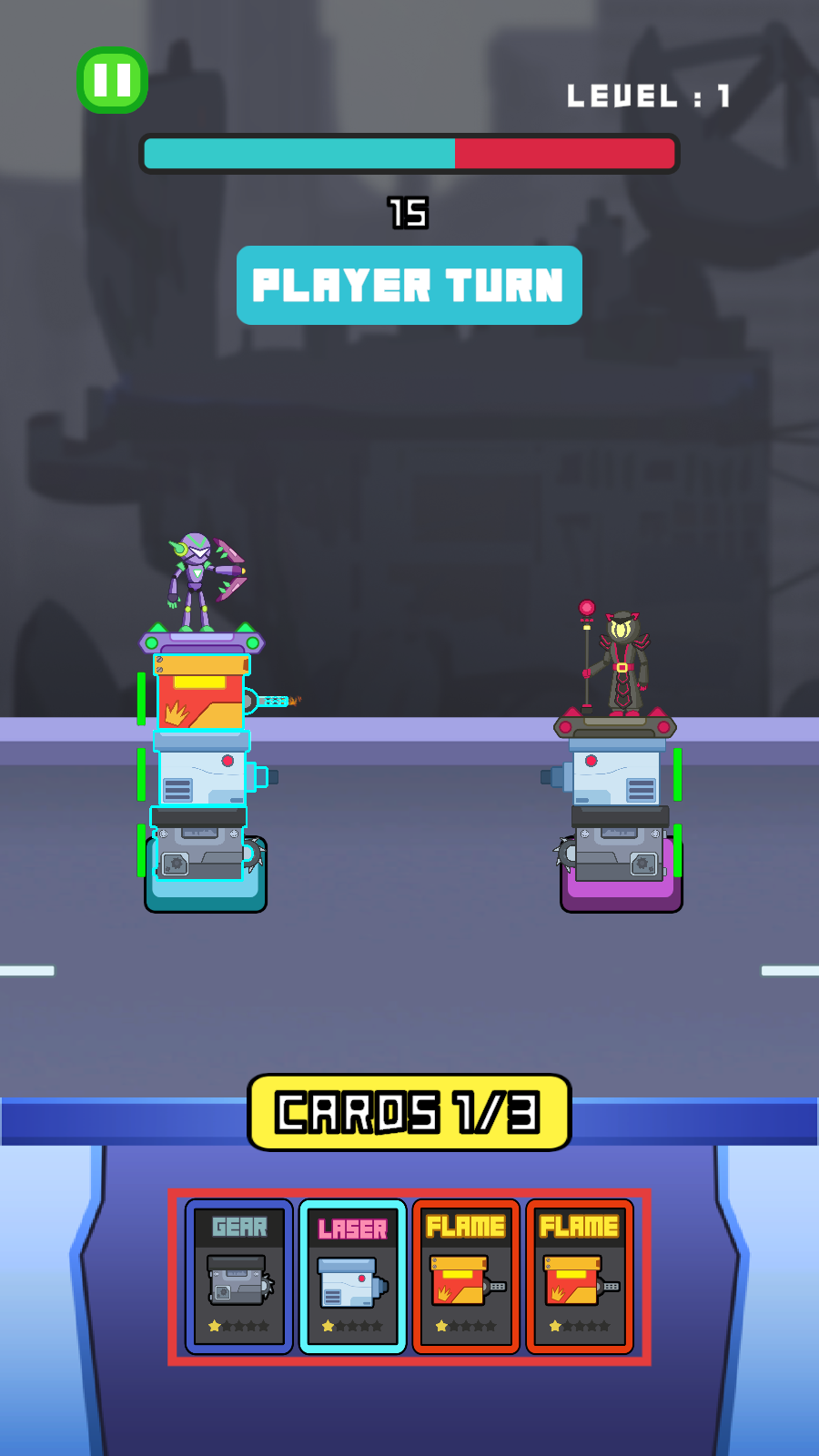1、在【PLAYER-TURN】回合,根据手牌【GEAR】【LASER】【FLAME】等卡牌情况,合理出牌攻击敌方单位。