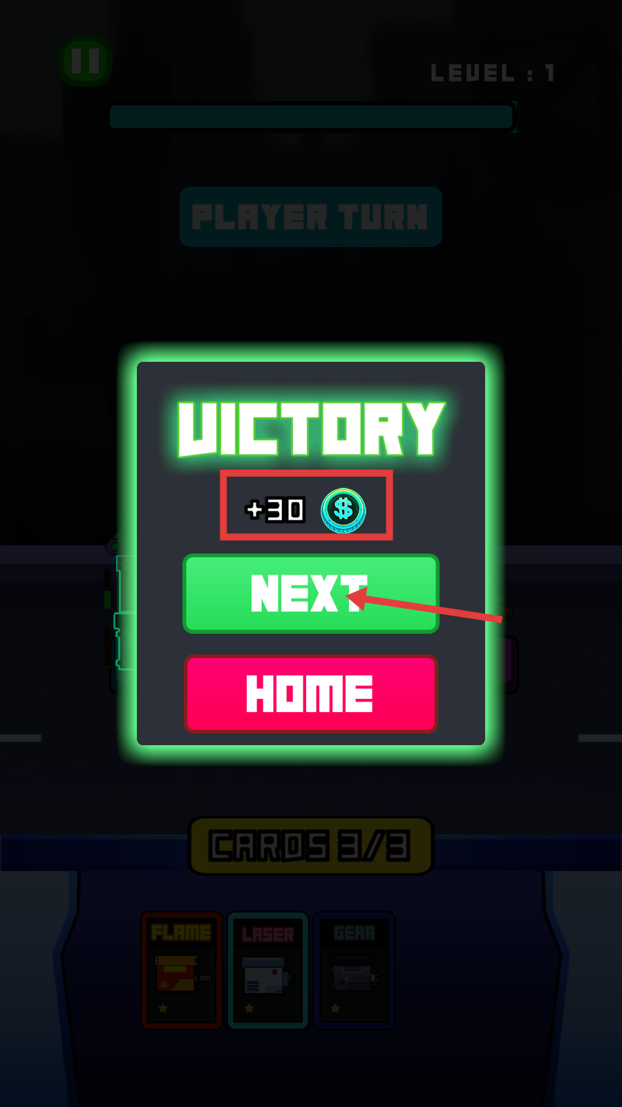 4、获胜后,领取【+30】金币奖励,可点击【NEXT】继续挑战,或点击【HOME】返回主界面。