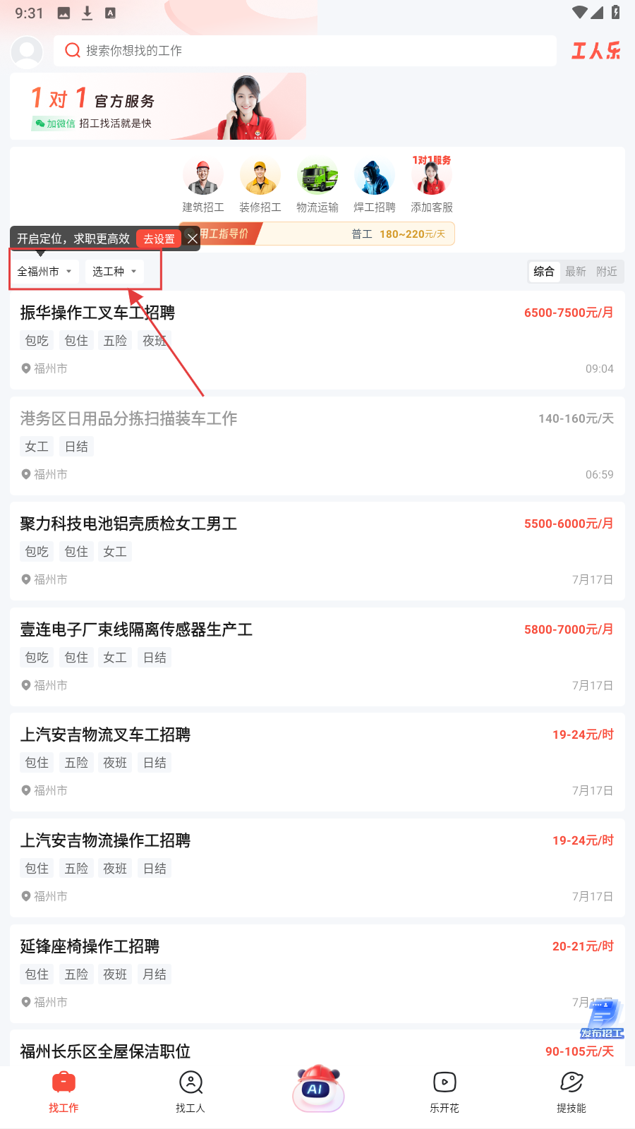 1、打开应用,在左侧点击【全福州市】、【选工种】进行筛选工作。