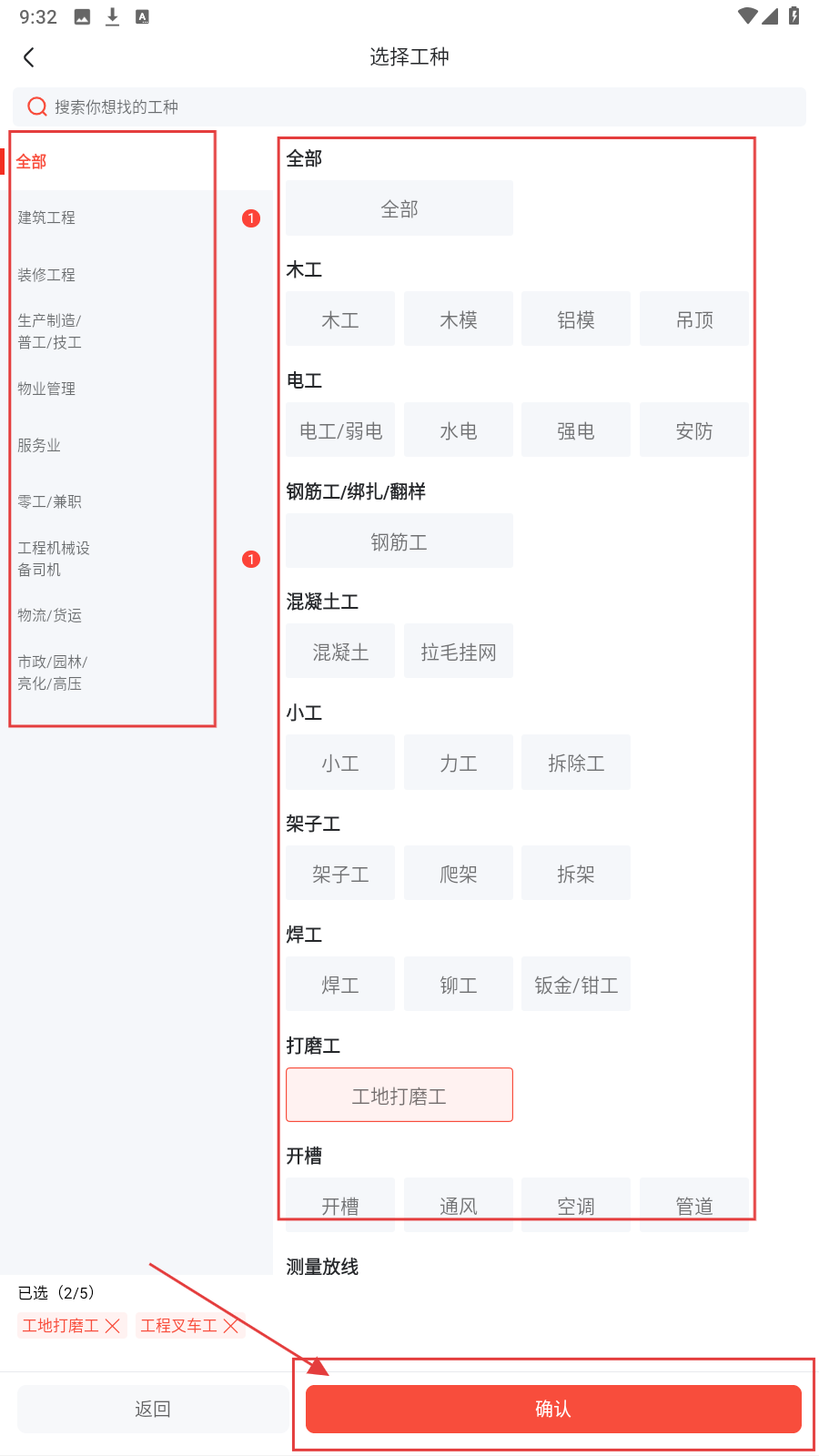 3、在【选择工种】页面选择想找的工作,选择完成点击【确定】。