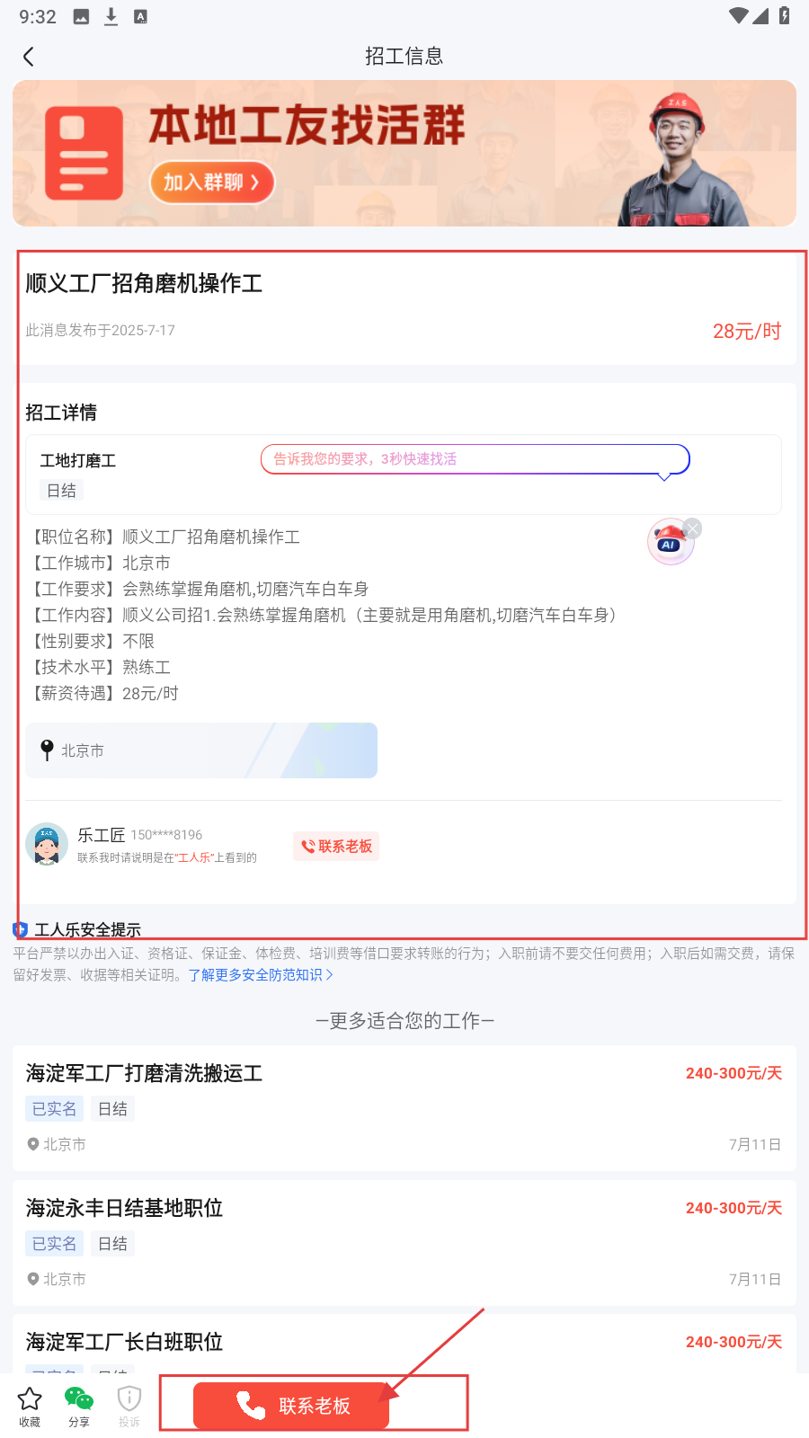 4、找到感兴趣的工作可以点击进入【招工信息】页面进行查看,如若对工作待遇满意点击【联系老板】即可。