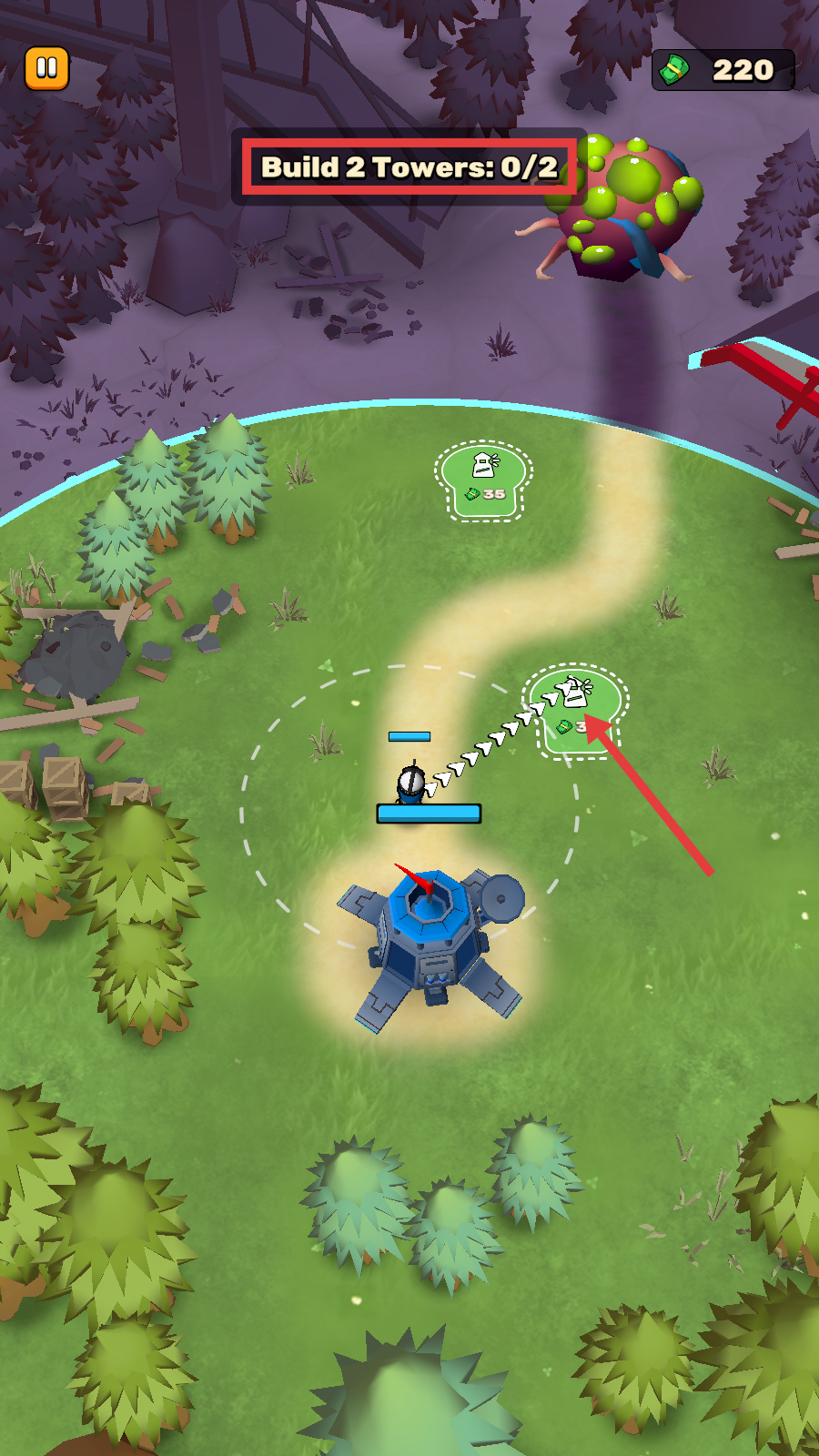 1、根据【Build-2-Towers:0/2】提示,利用金币在指定位置建造两座防御塔。