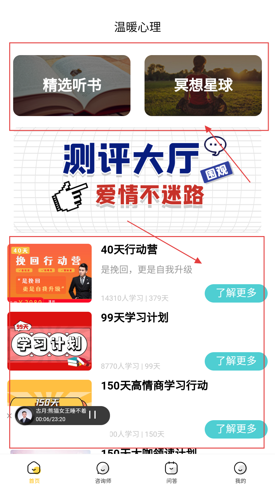 2、心理课程学习:汇聚国内外优质心理课程资源,内容涵盖情绪管理、亲密关系、自我成长等多个领域,支持碎片化学习。