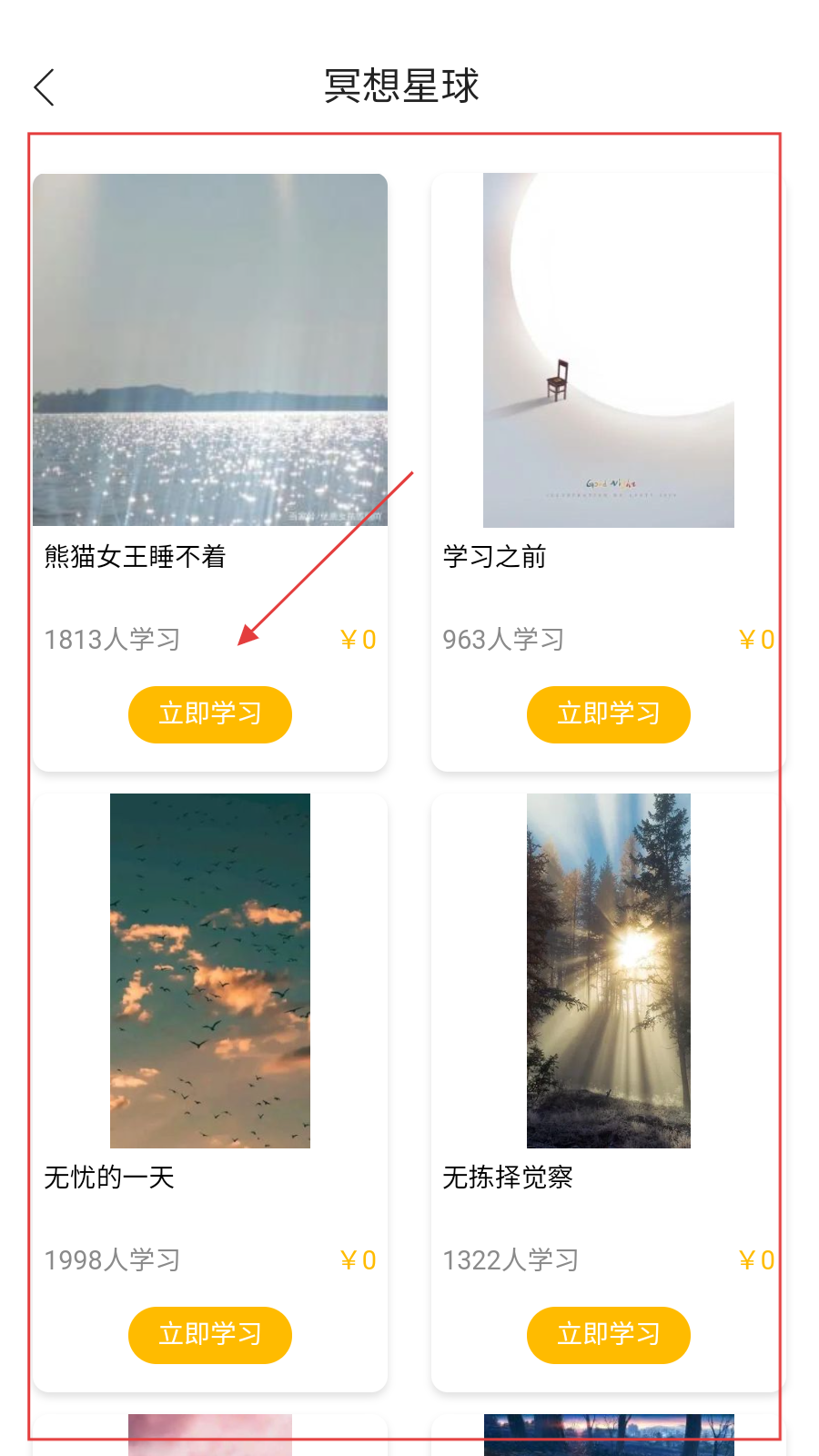 2、进入【冥想星球】页面,选择想听的音频,点击下方【立即学习】。
