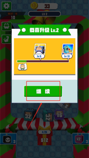 4、在升级提示出现时,点击“继续”按钮,以提升等级并获取更多游戏资源。