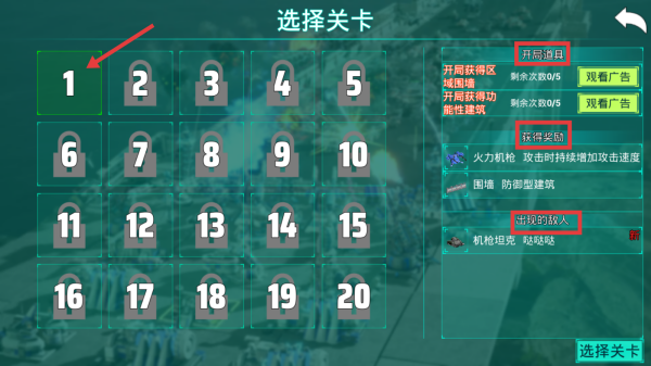 1、点击解锁的关卡进入游戏。可通过观看广告获取【开局道具】,了解【获得奖励】和【出现的敌人】信息,做好战前准备。