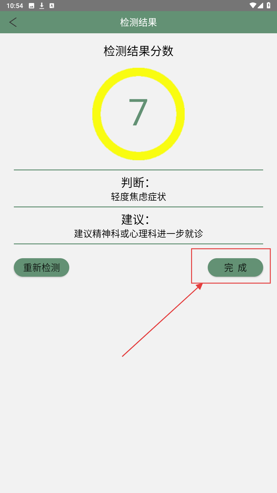 4、在【检测结果】页面查看检测结果分数,查看建议,查看完成后点击【完成】即可。