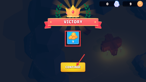 4、胜利后获得金币奖励,点击【CONTINUE】继续游戏,合理规划资源用于后续建设与升级。
