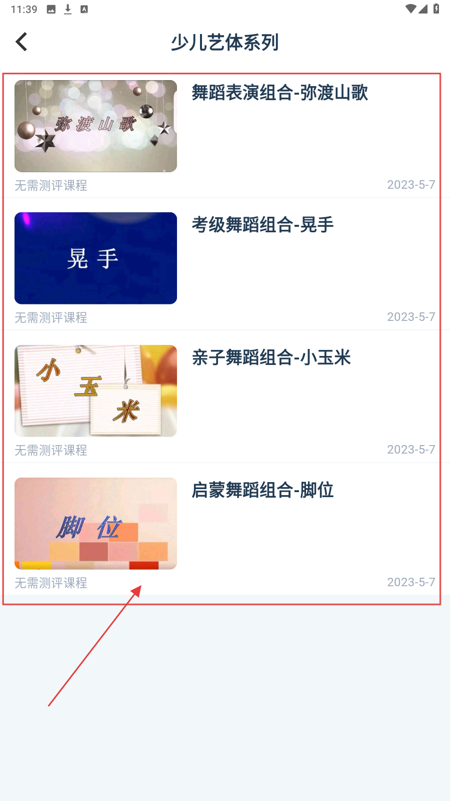 2、进入少儿艺体系列页面,可查看【舞蹈表演组合-弥渡山歌】【考级舞蹈组合-晃手】等课程,选择感兴趣的课程进入详情页面。