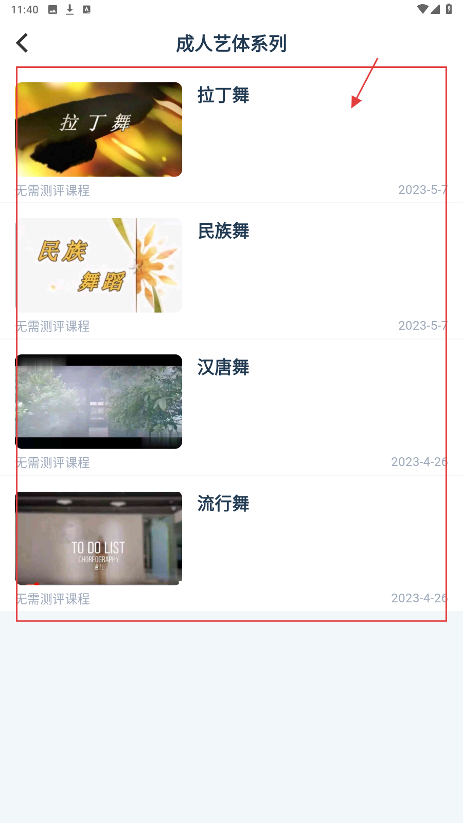 4、还有成人艺体系列页面,可查看【拉丁舞】【民族舞】等成人舞蹈课程,选择课程进行学习即可。