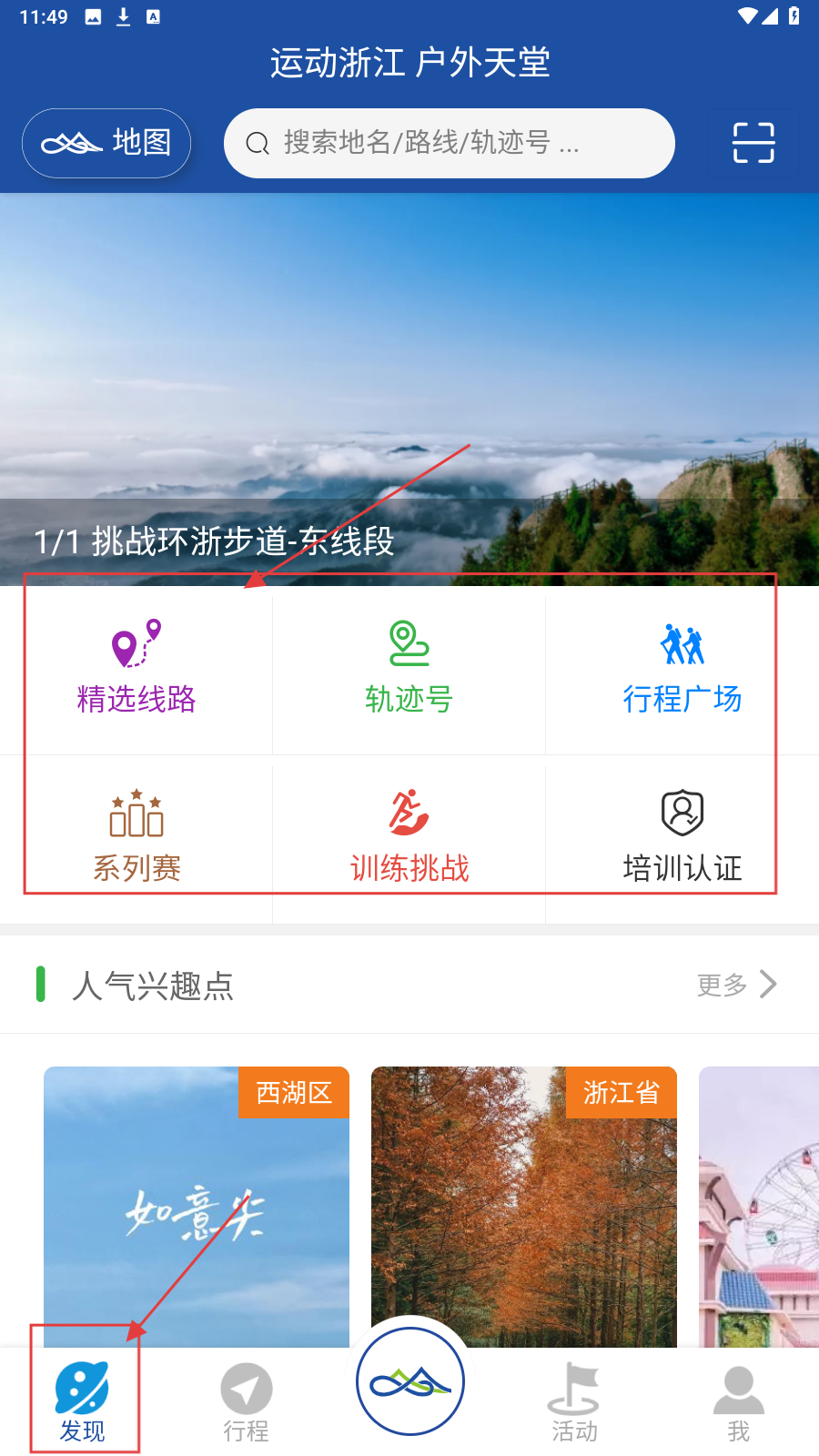 1、在【发现】页面,可使用【精选线路】【轨迹号】等功能,还能查看【系列赛】【训练挑战】等活动信息。