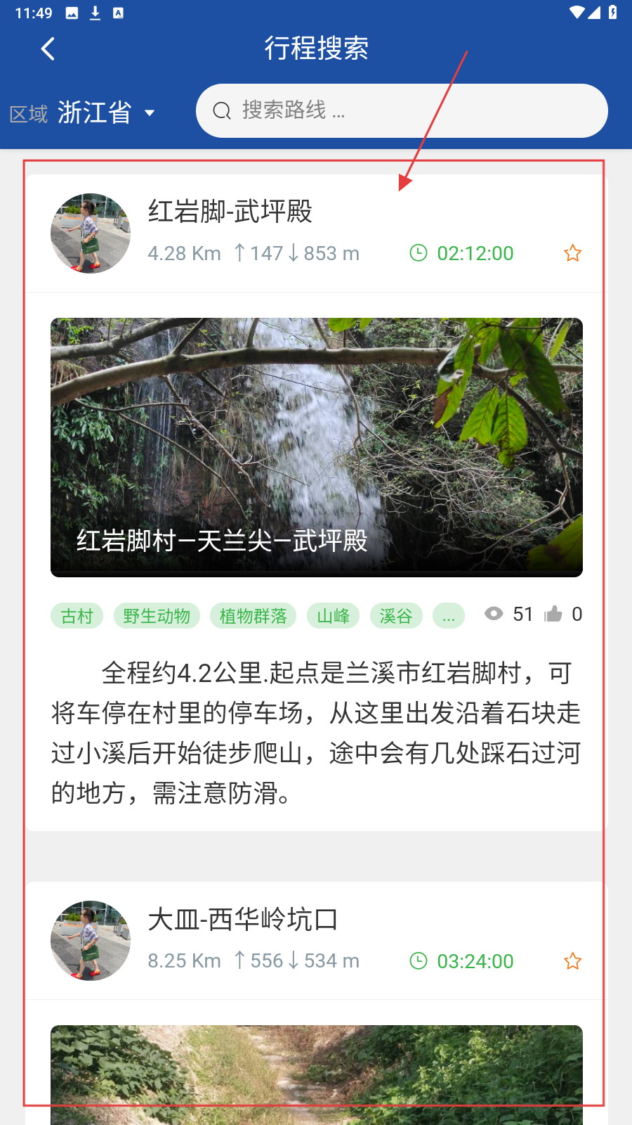 2、进入行程搜索页面,可查看【红岩脚-武坪殿】【大皿-西华岭坑口】等行程路线,选择感兴趣的路线进入详情页面。