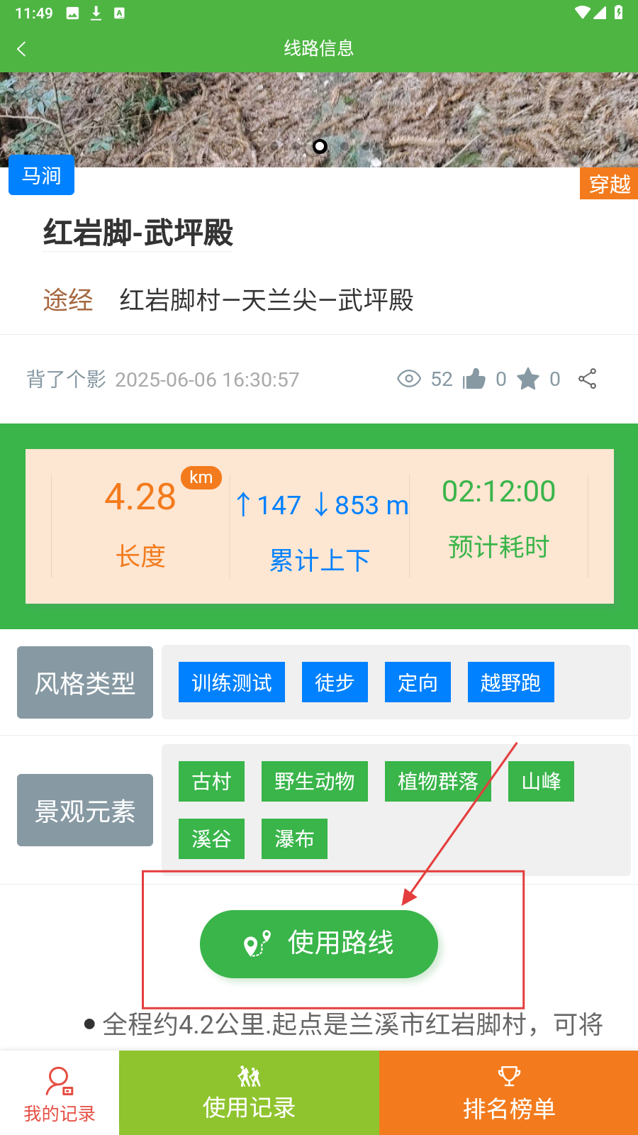3、进入【红岩脚-武坪殿】线路信息页面,点击【使用路线】按钮,可使用该路线进行徒步等活动。